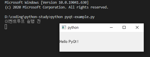 프로그램을 실행하면 아래와 같이 윈도우 프로그램을 뜨고, 이벤트 루프가 실행되며 창을 종료하면 prit("이벤트루프 실행 후")가 찍히게 된다.