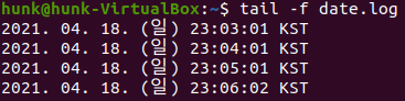 위에서 수행한 명령어를 tail -f 옵션을 통해 확인해보면 정상적으로 1분마다 수행되고 있음을 볼 수 있다.