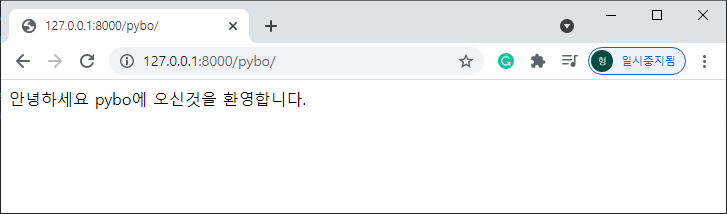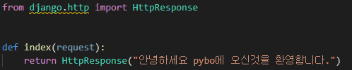 브라우저에서 http://localhost:8000/pybo 페이지에 요청했을 때, "안녕하세요 pybo에 오신것을 환영합니다." 라는 문자열을 출력하도록 구성해보자.
