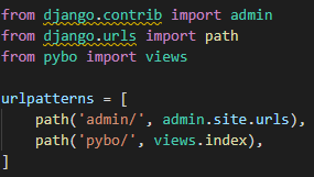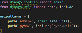 먼저 config/urls.py 파일에 /pybo URL에 대한 매핑을 추가하도록 하자.