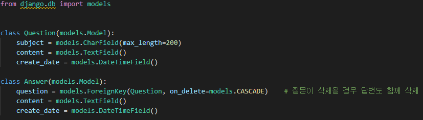 pybo/models.py 파일에 모델을 정의해보자.