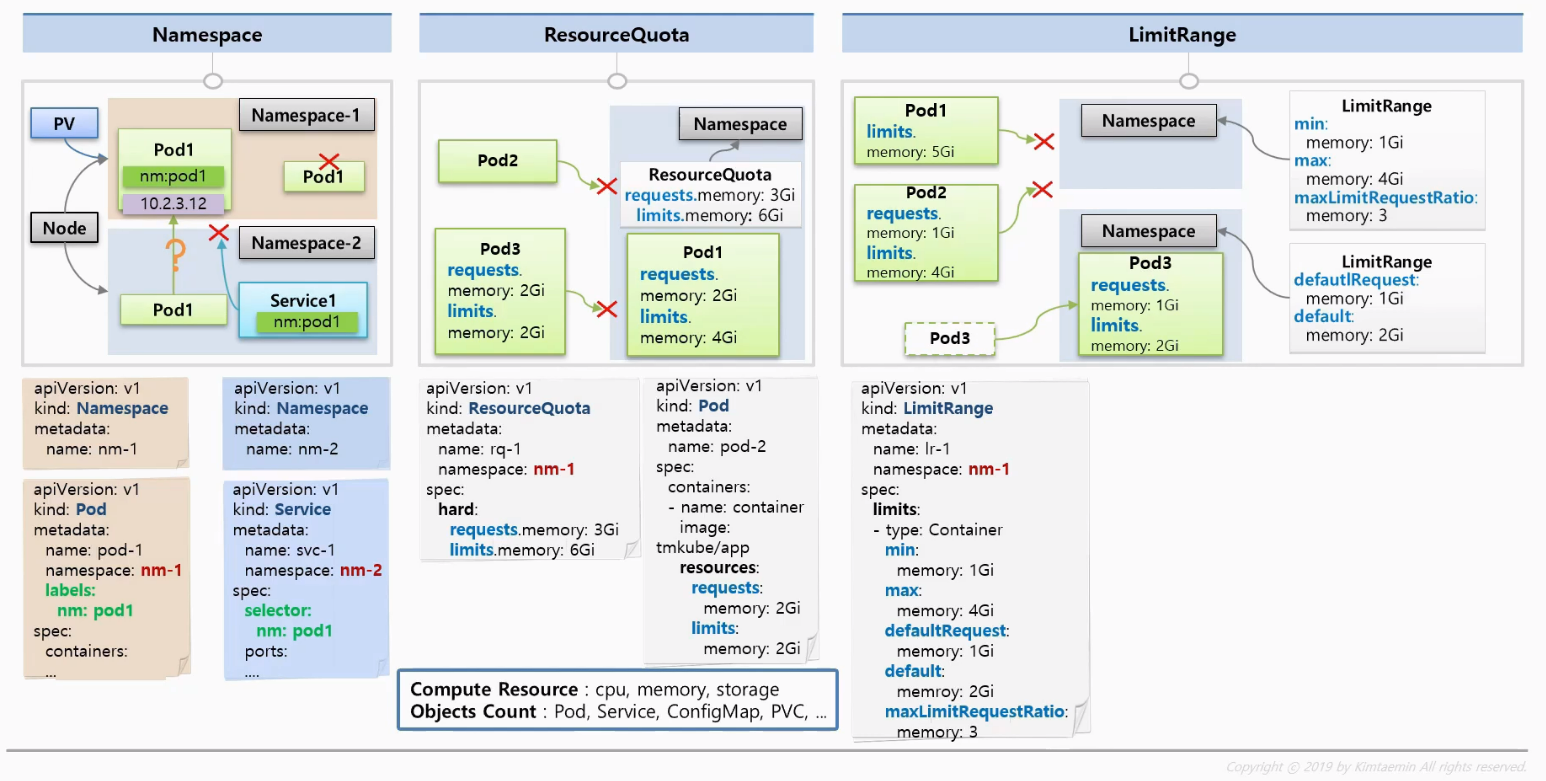 추가로 네임스페이스에는 ResourceQuota와 LimitRange를 설정할 수 있다.