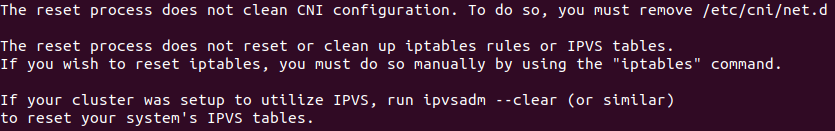 명령어를 수행하면 아래와 같이 메시지가 나오고 메뉴얼대로 /etc/cni/net.d 삭제할 것