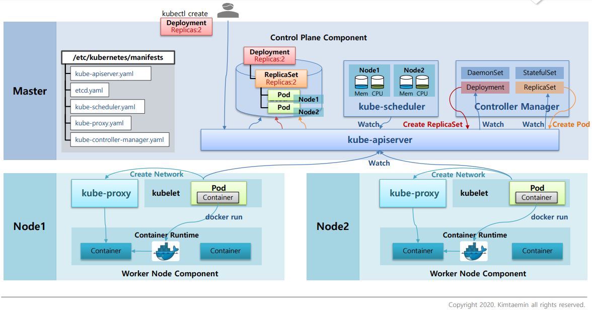 - 요청자가 kubectl create 명령어로 디플로이먼트(replicas:2) 생성 요청
