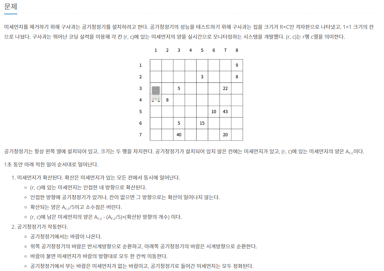 미세먼지를 제거하기 위해 구사과는 공기청정기를 설치하려고 한다. 공기청정기의 성능을 테스트하기 위해 구사과는 집을 크기가 R×C인 격자판으로 나타냈고, 1×1 크기의 칸으로 나눴다. 구사과는 뛰어난 코딩 실력을 이용해 각 칸 (r, c)에 있는 미세먼지의 양을 실시간으로 모니터링하는 시스템을 개발했다. (r, c)는 r행 c열을 의미한다. 공기청정기는 항상 왼쪽 열에 설치되어 있고, 크기는 두 행을 차지한다. 공기청정기가 설치되어 있지 않은 칸에는 미세먼