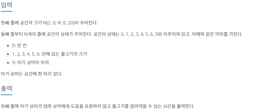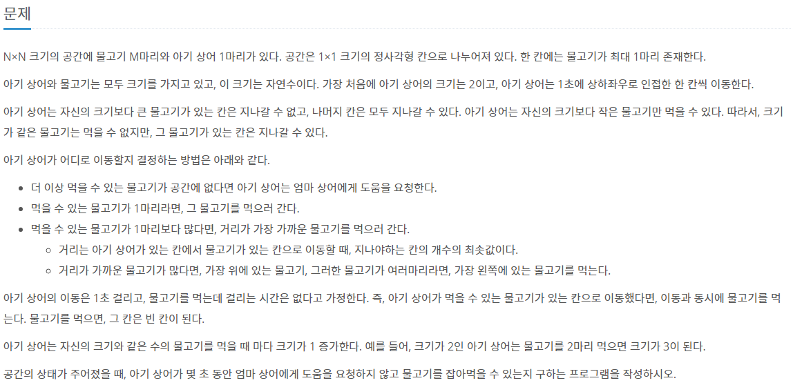 N×N 크기의 공간에 물고기 M마리와 아기 상어 1마리가 있다. 공간은 1×1 크기의 정사각형 칸으로 나누어져 있다. 한 칸에는 물고기가 최대 1마리 존재한다. 아기 상어와 물고기는 모두 크기를 가지고 있고, 이 크기는 자연수이다. 가장 처음에 아기 상어의 크기는 2이고, 아기 상어는 1초에 상하좌우로 인접한 한 칸씩 이동한다. 아기 상어는 자신의 크기보다 큰 물고기가 있는 칸은 지나갈 수 없고, 나머지 칸은 모두 지나갈 수 있다. 아기 상어는 자신의 크