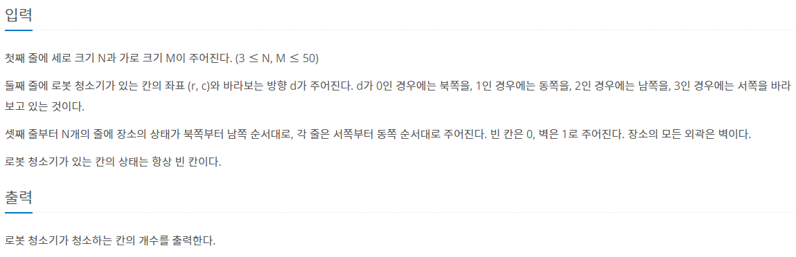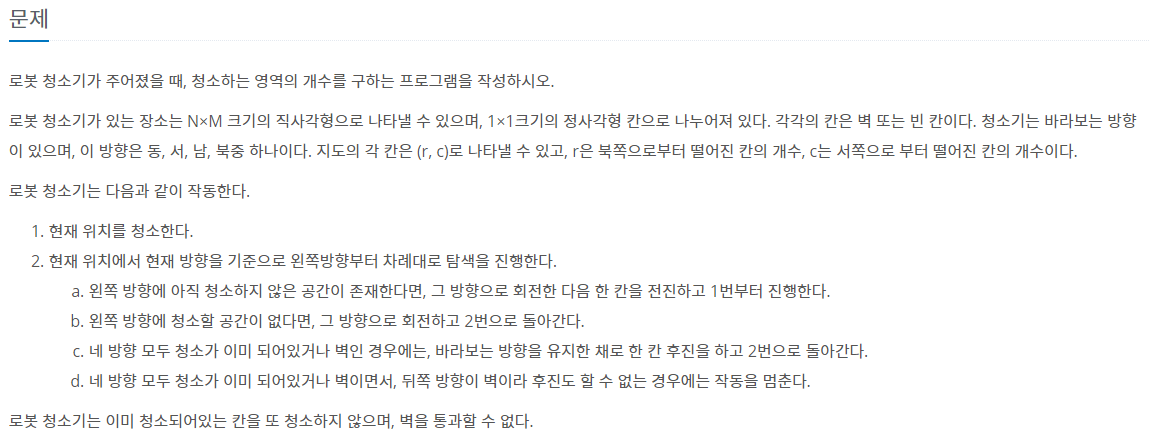 로봇 청소기가 주어졌을 때, 청소하는 영역의 개수를 구하는 프로그램을 작성하시오. 로봇 청소기가 있는 장소는 N×M 크기의 직사각형으로 나타낼 수 있으며, 1×1크기의 정사각형 칸으로 나누어져 있다. 각각의 칸은 벽 또는 빈 칸이다. 청소기는 바라보는 방향이 있으며, 이 방향은 동, 서, 남, 북중 하나이다. 지도의 각 칸은 (r, c)로 나타낼 수 있고, r은 북쪽으로부터 떨어진 칸의 개수, c는 서쪽으로 부터 떨어진 칸의 개수이다. 로봇 청소기는 다음